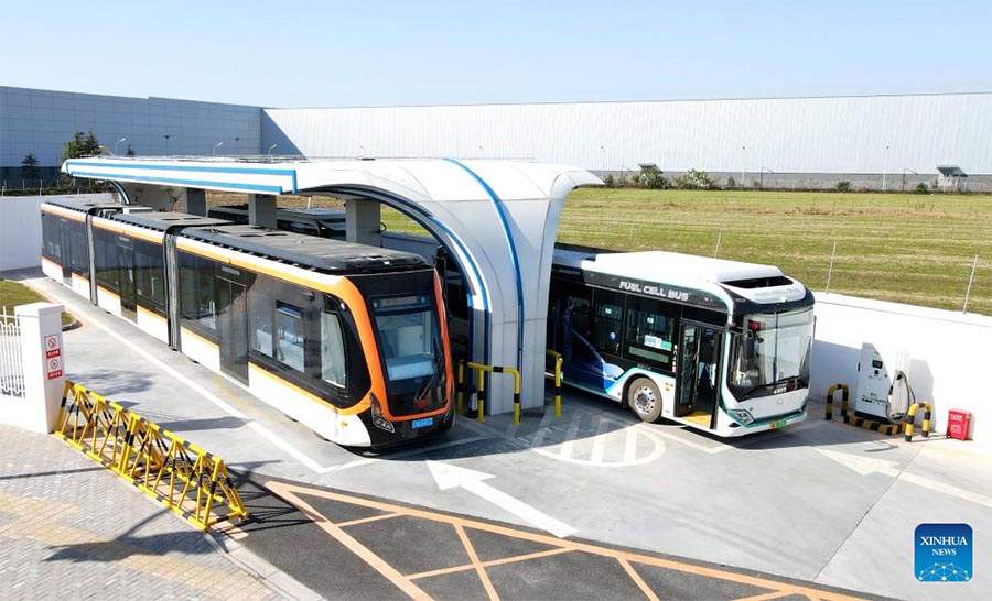 A medium-capacity hydrogen fuel cell-powered public bus (R) approaches a hydrogen refueling station in Lingang new area of Pudong New Area in east China's Shanghai, Dec. 15, 2022. As a demonstrative zone for commercial operation of hydrogen fuel cell-powered vehicles in Shanghai, Lingang new area has walked an extra mile since early 2022 to put more hydrogen fuel cell-powered public buses into practical service and to date 66 units of its kind are now running on the roads there. Another 52 units have already started zero-payload trial operation and are expected to kick off their official service before the end of this year. (Xinhua/Fang Zhe)