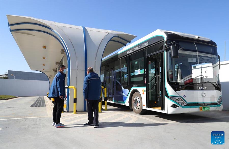 A hydrogen fuel cell-powered public bus is refueled at a hydrogen refueling station in Lingang new area of Pudong New Area in east China's Shanghai, Dec. 15, 2022. As a demonstrative zone for commercial operation of hydrogen fuel cell-powered vehicles in Shanghai, Lingang new area has walked an extra mile since early 2022 to put more hydrogen fuel cell-powered public buses into practical service and to date 66 units of its kind are now running on the roads there. Another 52 units have already started zero-payload trial operation and are expected to kick off their official service before the end of this year. (Xinhua/Fang Zhe)