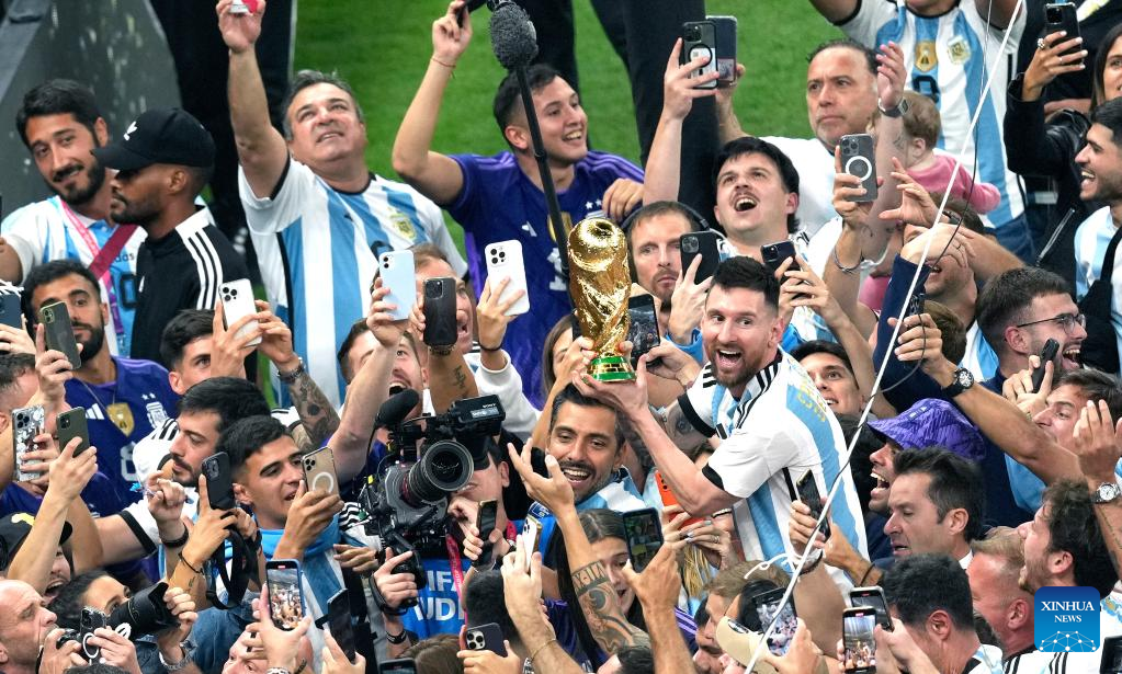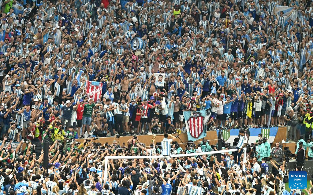 Fans and players of Argentina celebrate victory after the awarding ceremony of the 2022 FIFA World Cup at Lusail Stadium in Lusail, Qatar, Dec. 18, 2022. (Xinhua/Xiao Yijiu)