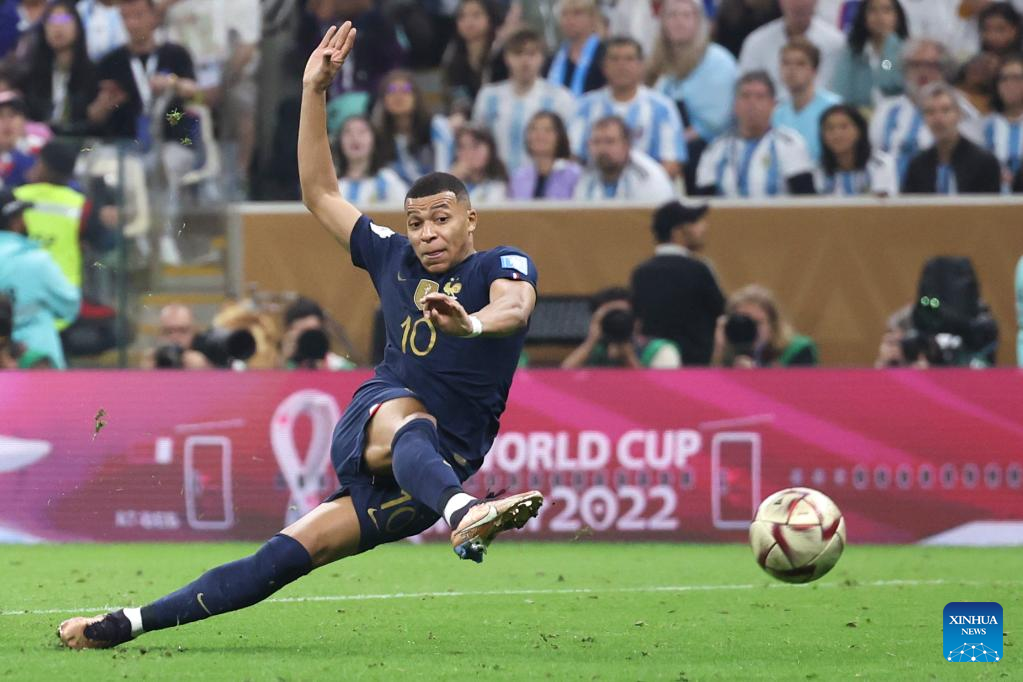 Kylian Mbappe of France scores during the Final between Argentina and France at the 2022 FIFA World Cup at Lusail Stadium in Lusail, Qatar, Dec. 18, 2022. (Xinhua/Li Ming)