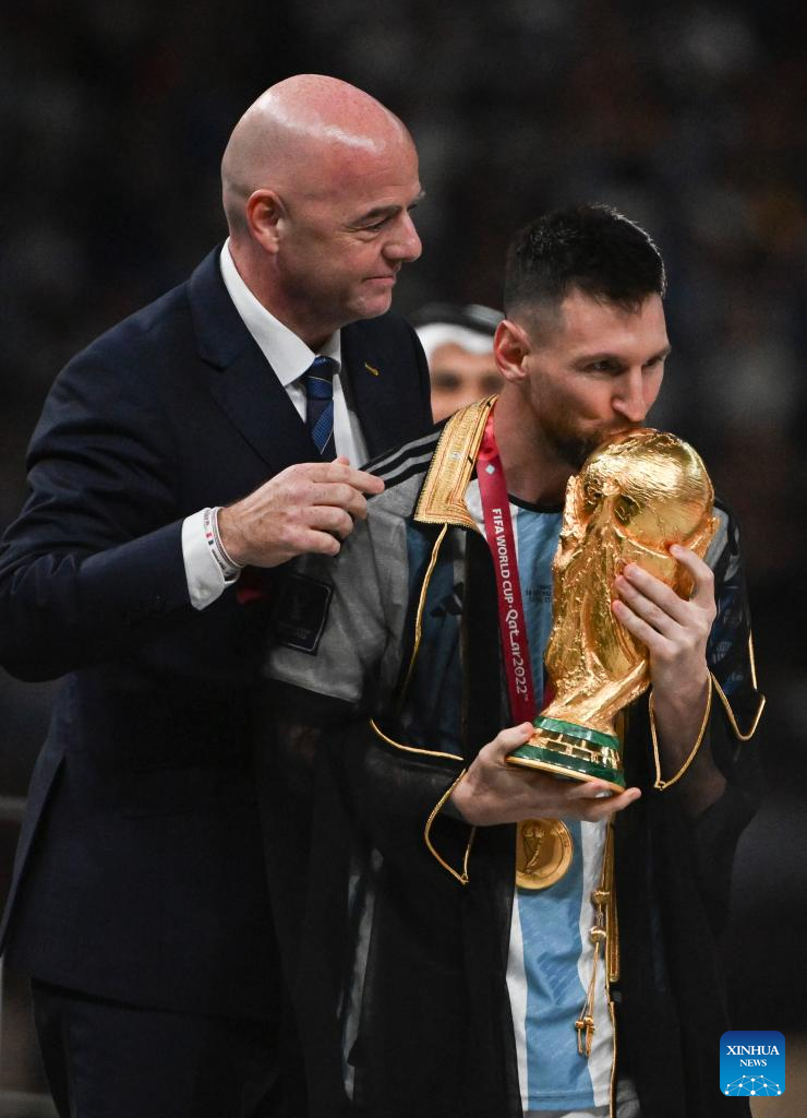 Lionel Messi of Argentina celebrates with the World Cup Trophy after the awarding ceremony of the 2022 FIFA World Cup at Lusail Stadium in Lusail, Qatar, Dec. 18, 2022. (Xinhua/Pan Yulong)