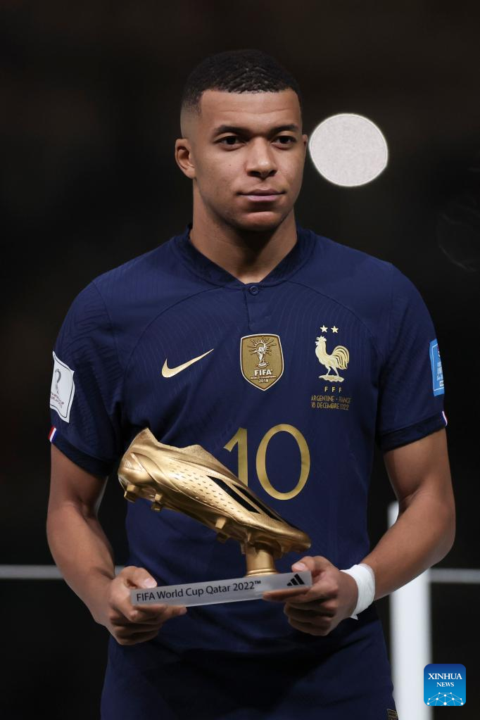 Kylian Mbappe of France poses with his golden boot trophy during during the awarding ceremony of the 2022 FIFA World Cup at Lusail Stadium in Lusail, Qatar, Dec. 18, 2022. (Xinhua/Cao Can)