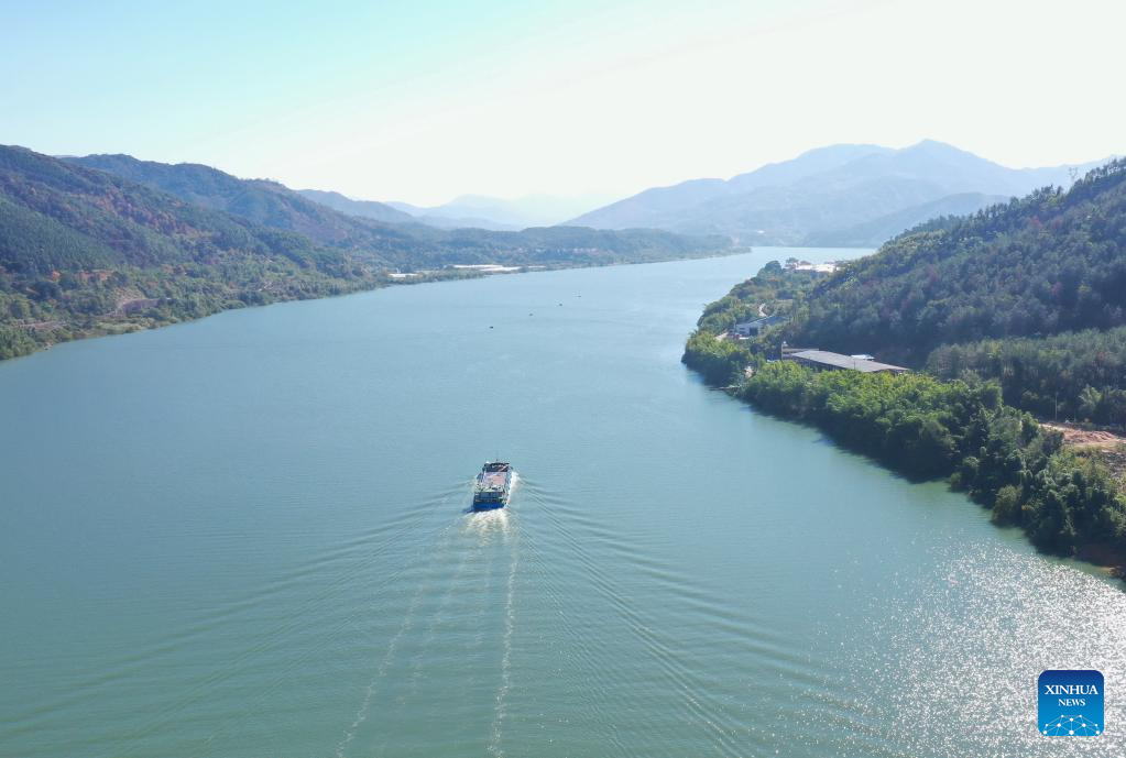 This aerial photo shows a new energy cargo ship sailing in the Minjiang River in southeast China's Fujian Province on Dec. 18, 2022. (Xinhua/Lin Shanchuan)