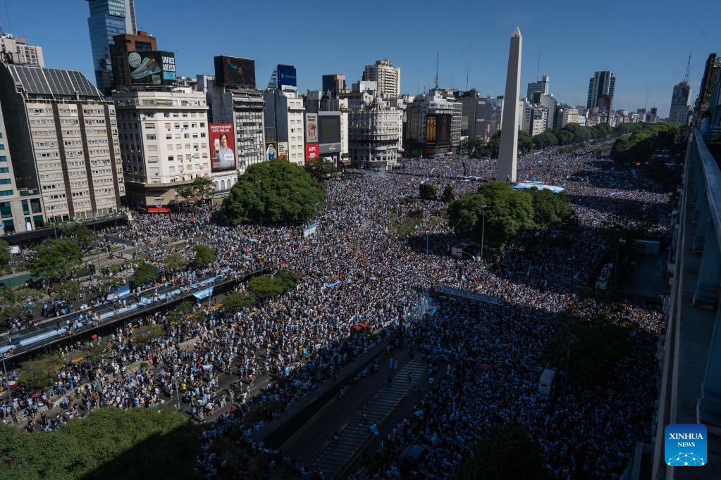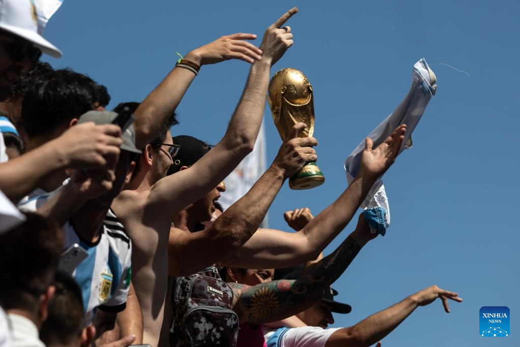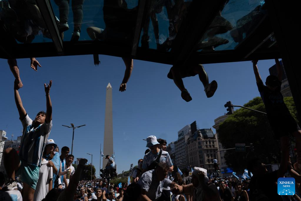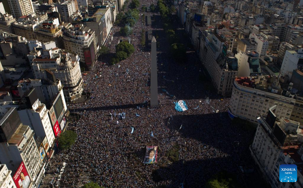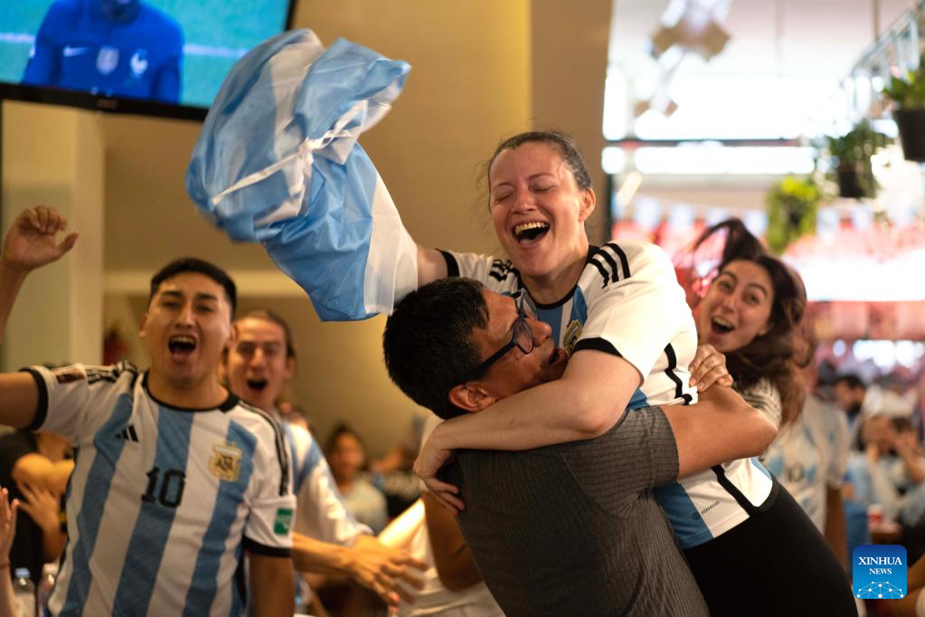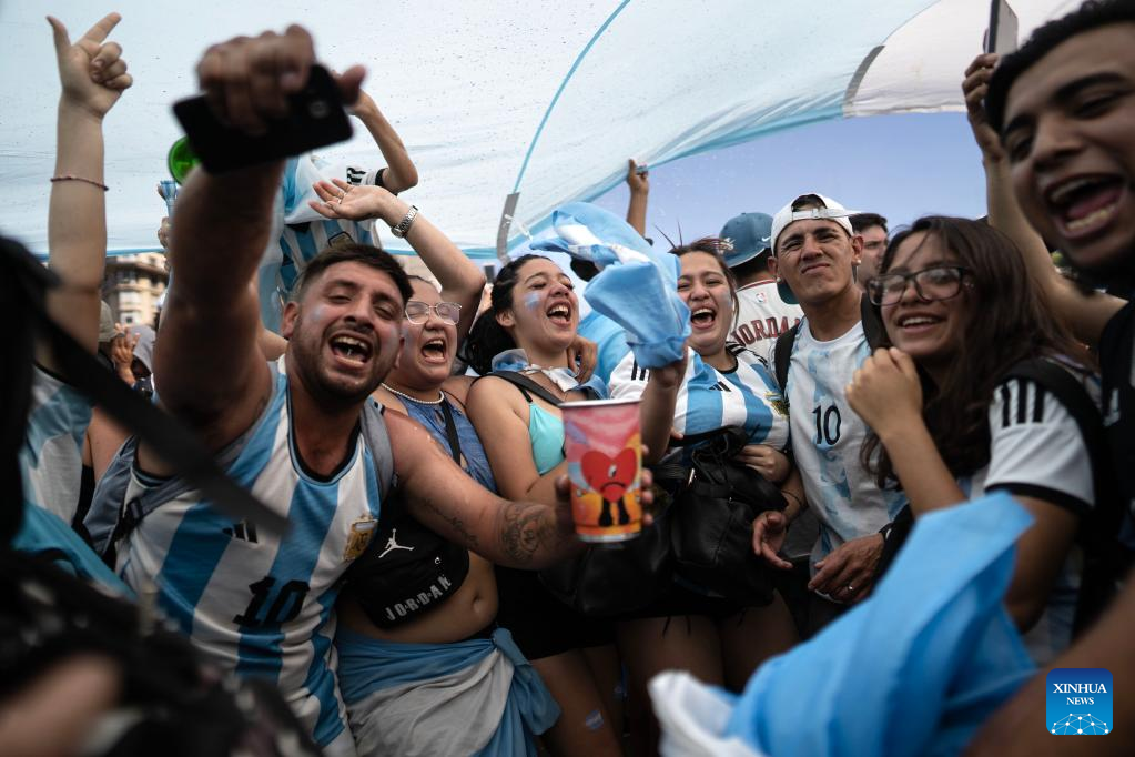 Fans of Argentina celebrate after their team winning the Final of the 2022 FIFA World Cup in Buenos Aires, capital of Argentina, Dec. 18, 2022. (Photo by Martin Zabala/Xinhua)