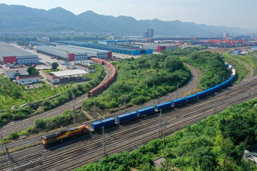 Aerial photo taken on June 30, 2022 shows a China-Europe freight train pulling out of the Tuanjiecun station in southwest China's Chongqing Municipality. (Xinhua/Tang Yi)