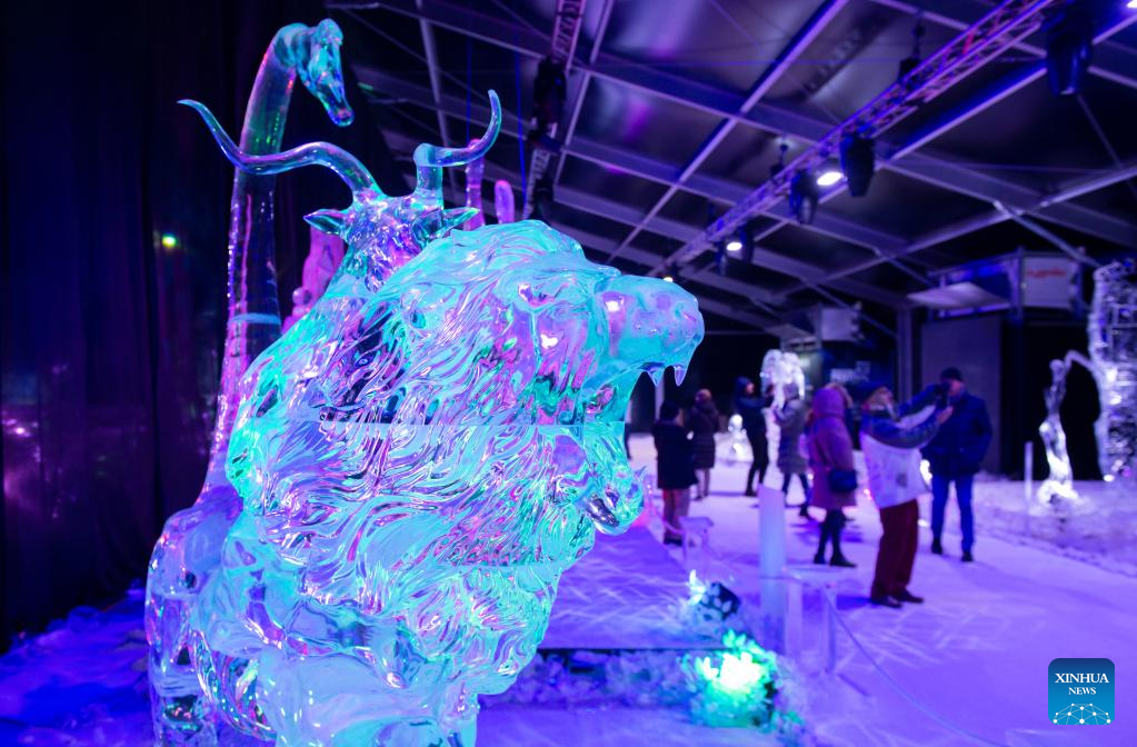 Visitors enjoy the ice sculptures on display at the Ice Festival in Torrejon de Ardoz, Madrid, Spain, on Dec. 15, 2022. (Photo by Gustavo Valiente/Xinhua)
