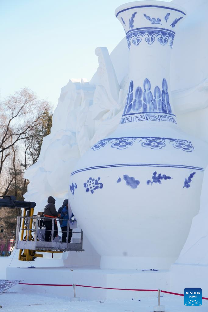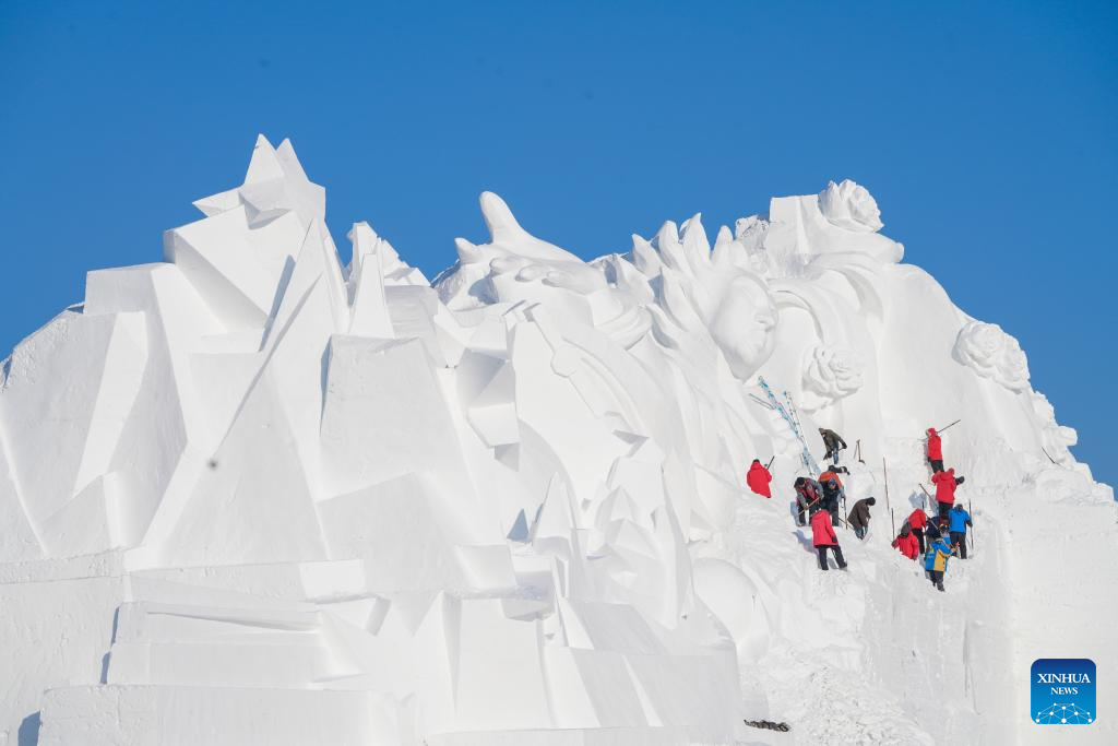 Staff members finish a gigantic snow sculpture for the upcoming 35th Taiyangdao Island International Snow Sculpture Expo in Harbin, northeast China's Heilongjiang Province, Dec. 18, 2022. (Xinhua/Wang Song)