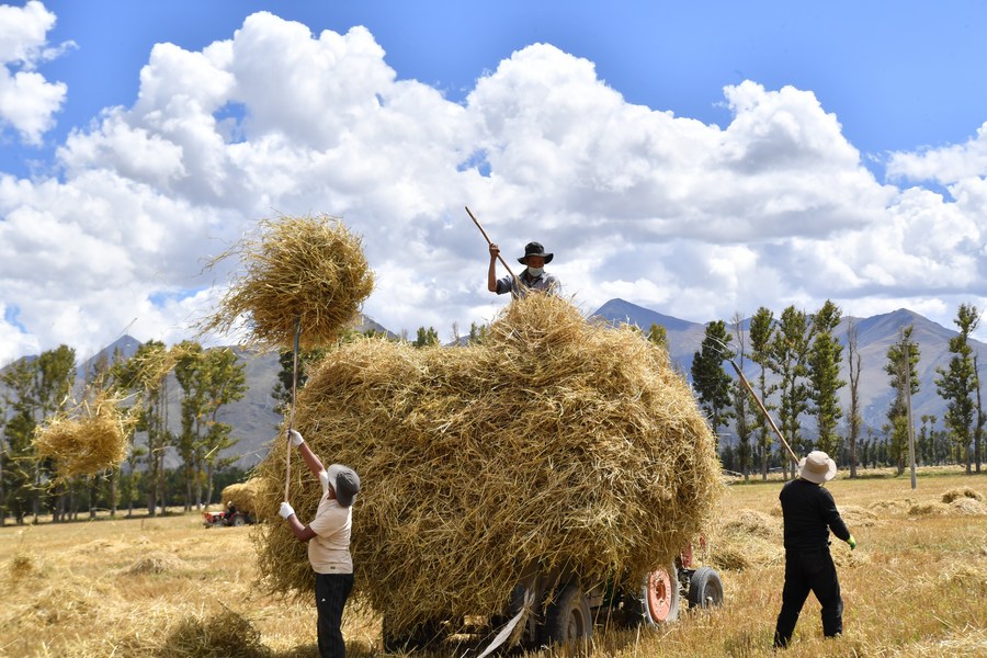 Villagers collect straws in a highland barley field in Bianlin Township, Lhunzhub County of Lhasa, southwest China's Tibet Autonomous Region, Sept. 21, 2022. (Xinhua/Chogo)