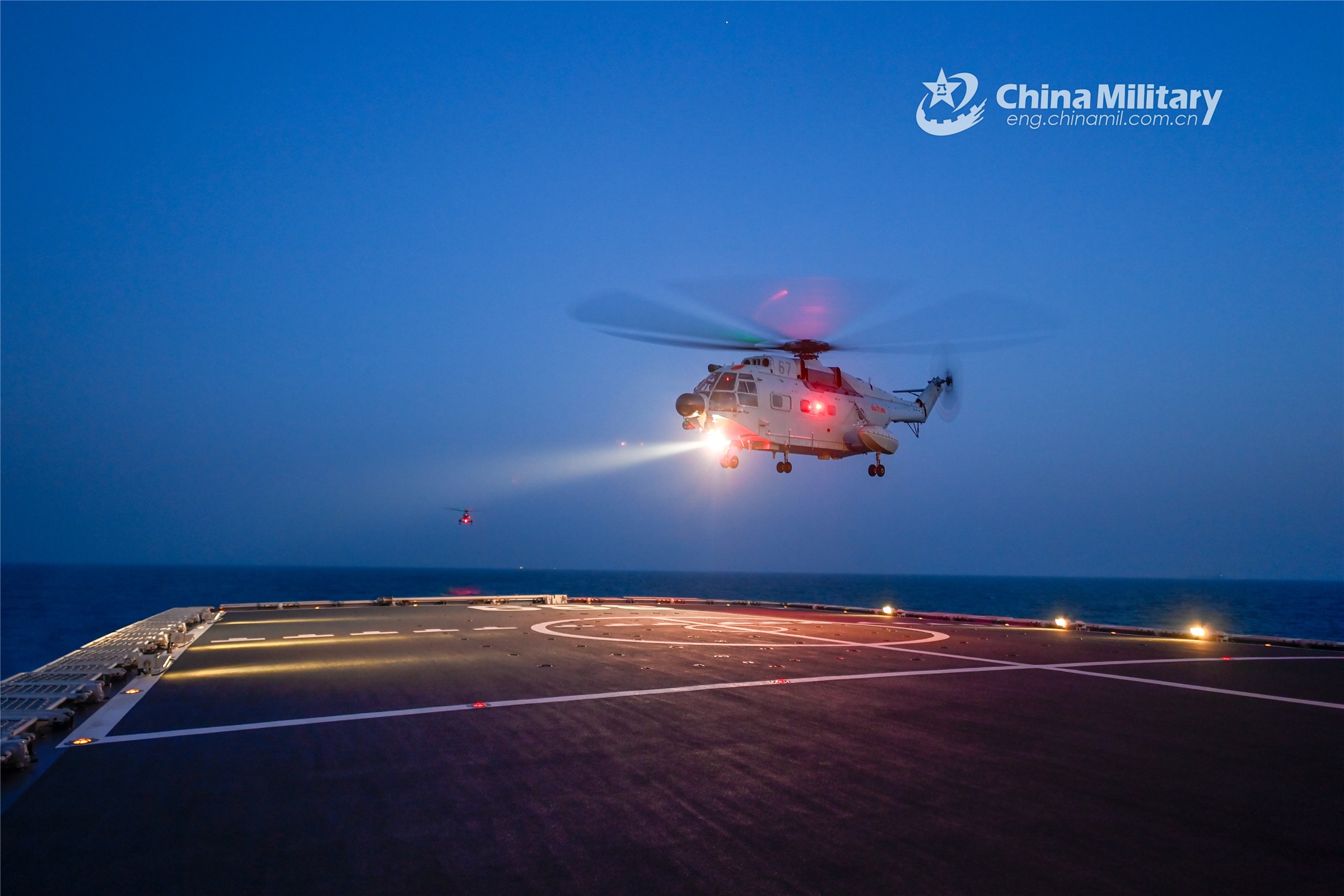 A ship-borne helicopter lands onto a warship attached to a combat support flotilla with the navy under the PLA Northern Theatre Command during a training exercise held on November 15, 2022. (eng.chinamil.com.cn/Photo by Zhou Yuanzhi)