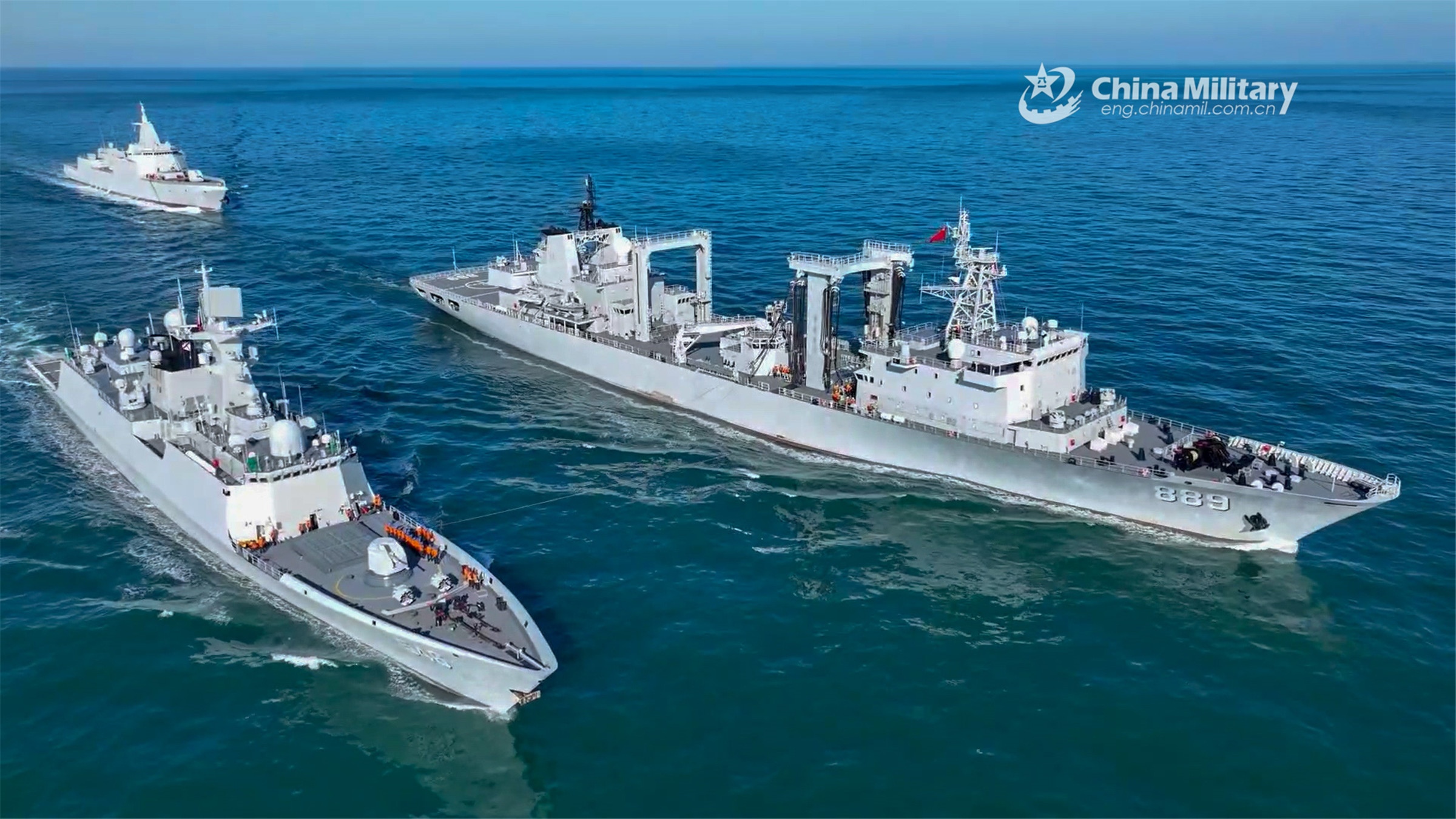 A supply ship attached to a combat support flotilla with the navy under the PLA Northern Theatre Command conducts alongside replenishment and astern replenishment at the same time during a training exercise held on November 16, 2022. (eng.chinamil.com.cn/Photo by Zhou Yuanzhi)