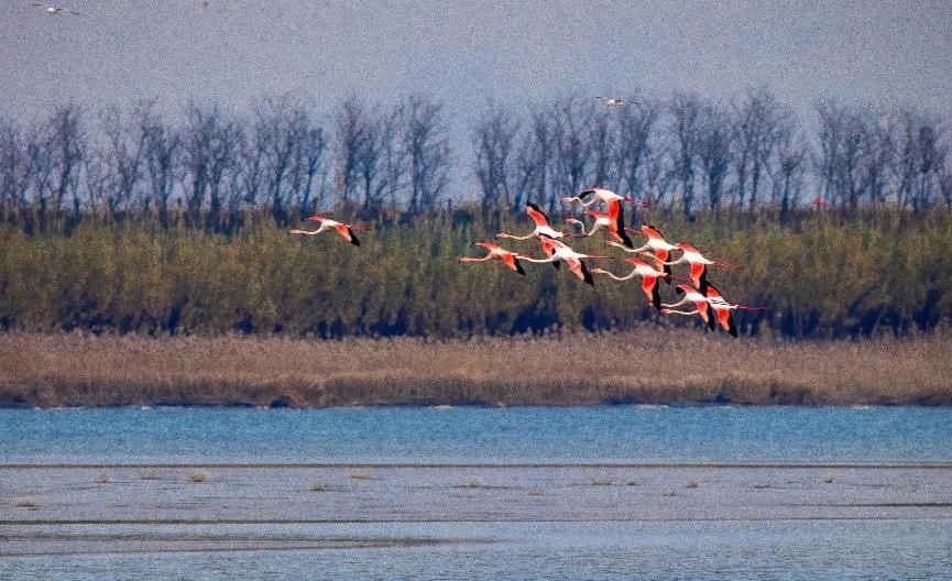 Photo taken on Dec. 15, 2022 shows flamingoes hovering over the Tiaozini Wetland in Dongtai city, east China's Jiangsu province. (People's Daily Online/Sun Jialu)
