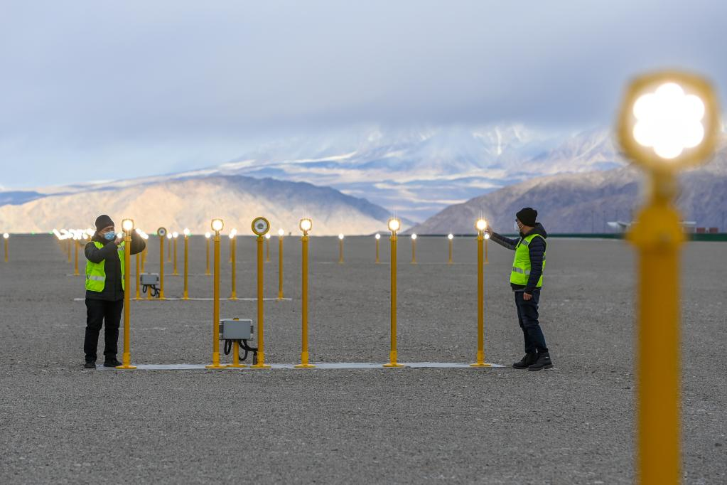 Staff members check navigation light system at a new super-high plateau airport in Taxkorgan Tajik Autonomous County, northwest China's Xinjiang Uygur Autonomous Region, Dec. 19, 2022. (Xinhua/Ding Lei)