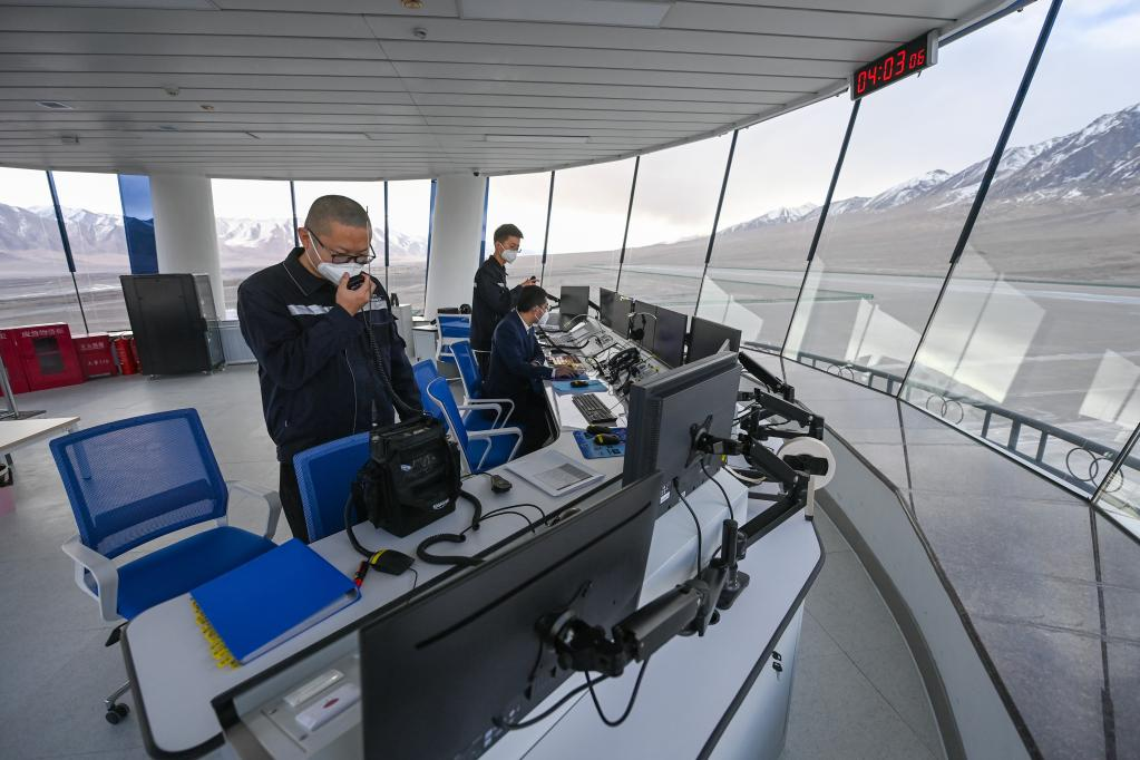 Staff members conduct communication test at the control tower of a new super-high plateau airport in Taxkorgan Tajik Autonomous County, northwest China's Xinjiang Uygur Autonomous Region, Dec. 19, 2022. (Xinhua/Ding Lei)