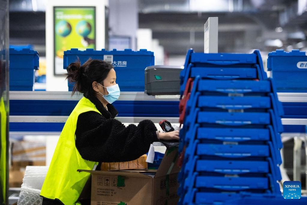 A staff member registers information of medicines at a logistics center of a pharmacy in Kaifu District of Changsha, central China's Hunan Province, Dec. 20, 2022. (Xinhua/Chen Sihan)