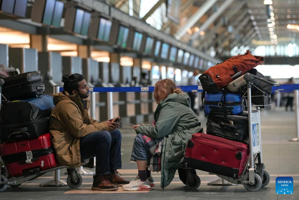 People sit on trolleys at Vancouver International Airport in Richmond, British Columbia, Canada, on Dec. 20, 2022. (Photo by Liang Sen/Xinhua)