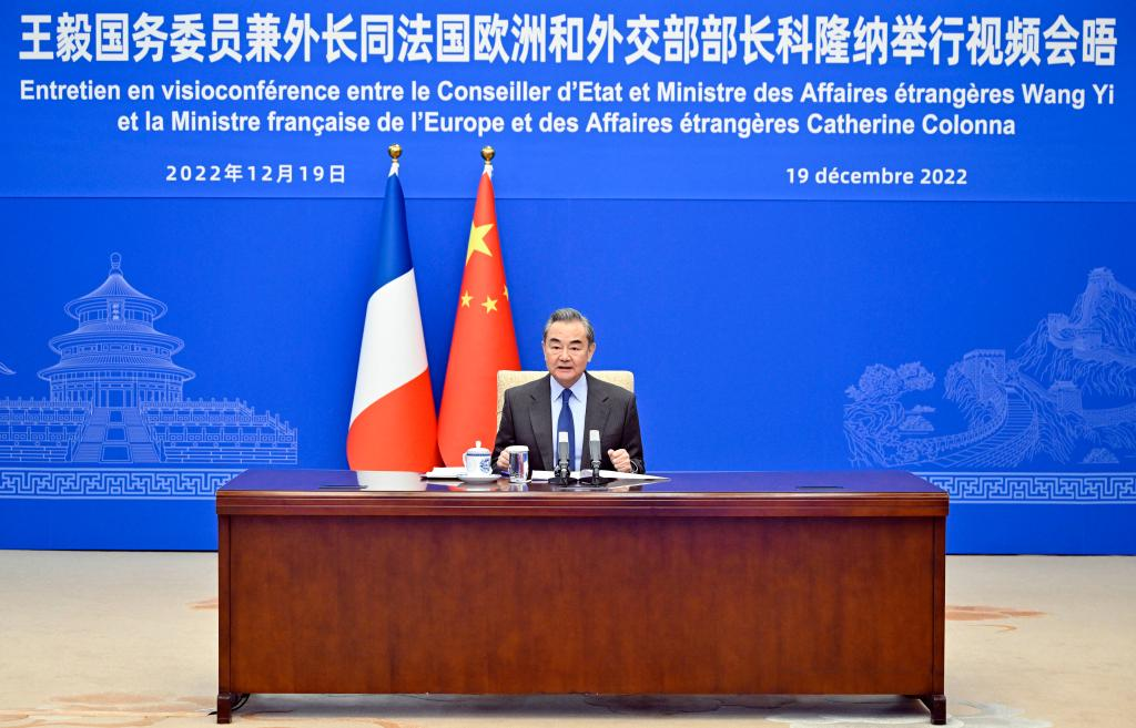 Chinese State Councilor and Foreign Minister Wang Yi, also a member of the Political Bureau of the Communist Party of China (CPC) Central Committee, meets with French Foreign Affairs Minister Catherine Colonna via video link, Dec 19, 2022. [Photo/Xinhua]