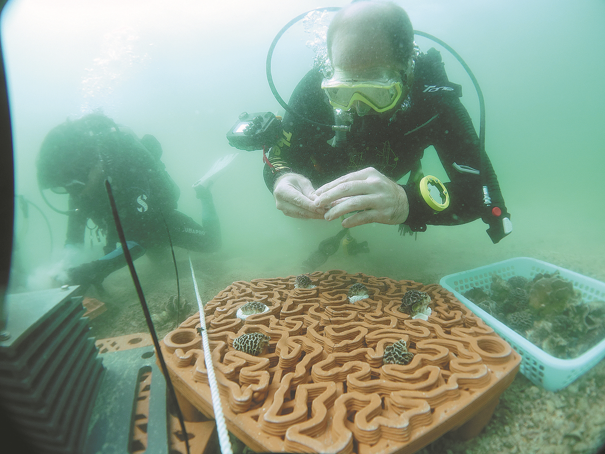 Divers transplant corals onto the 3D-printed reef tiles produced by Archireef, a Hong Kong startup. [Photo provided to China Daily]