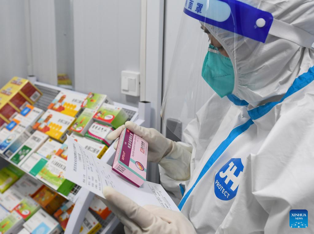 A medical worker prepares medicine for patients according to prescription at a fever clinic in Weiyang District of Xi'an, northwest China's Shaanxi Province, Dec. 20, 2022. (Photo by Zou Jingyi/Xinhua)