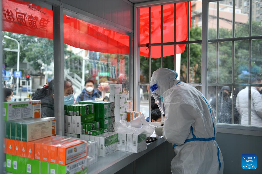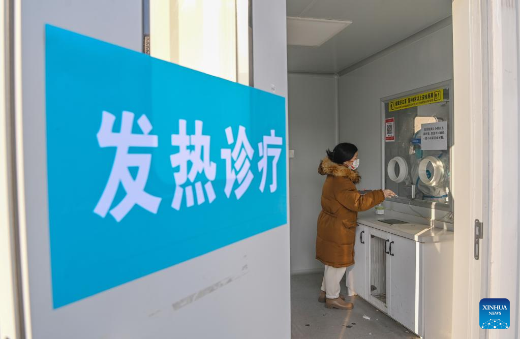 A resident collects medicine at a fever clinic in Kaifu District of Changsha, central China's Hunan Province, Dec. 20, 2022. (Xinhua/Chen Zhenhai)