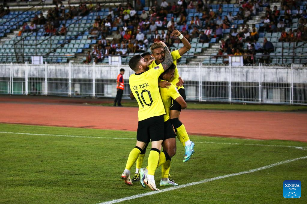Malaysia's players celebrate scoring during the ASEAN Football Federation (AFF) Mitsubishi Electric Cup 2022 group B match between Myanmar and Malaysia at Thuwunna Stadium in Yangon, Myanmar, Dec. 21, 2022. (Photo by Myo Kyaw Soe/ Xinhua)