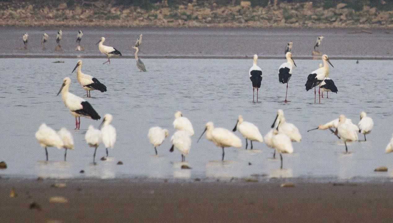Oriental storks and Eurasian spoonbills are seen on a wetland near the Poyang Lake in east China's Jiangxi province, Dec. 8, 2022. (People's Daily Online/Fu Jianbin)
