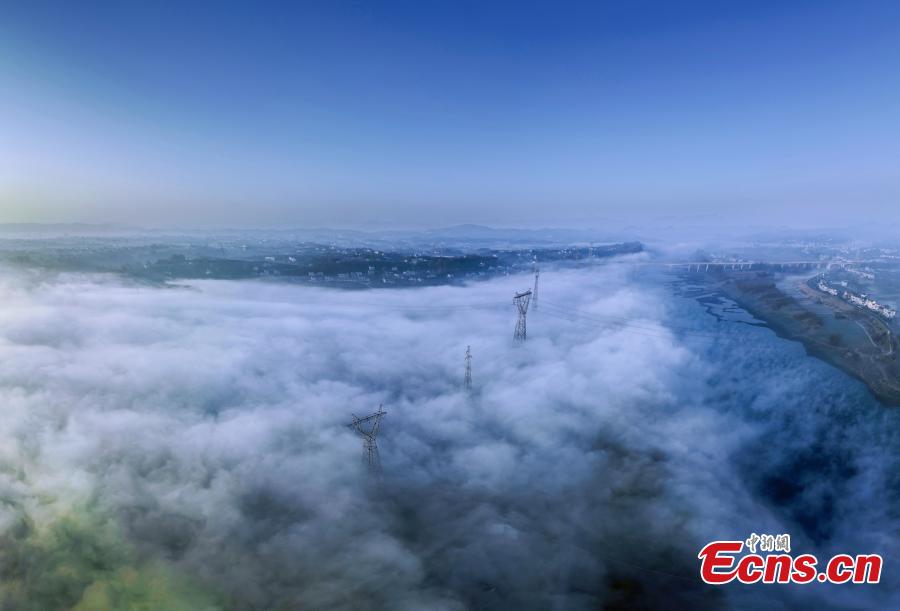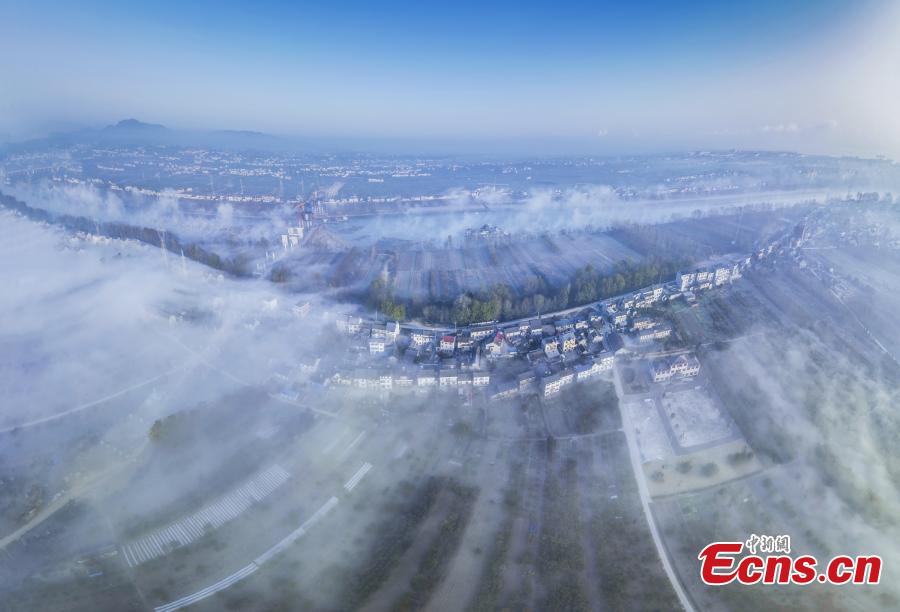 Advection fog shrouds Yidu, central China's Hubei Province, in the morning. The spectacle happens when the wind blows moist and warm air over a colder surface and cools down. (Photo: China News Service/Cao Lida)
