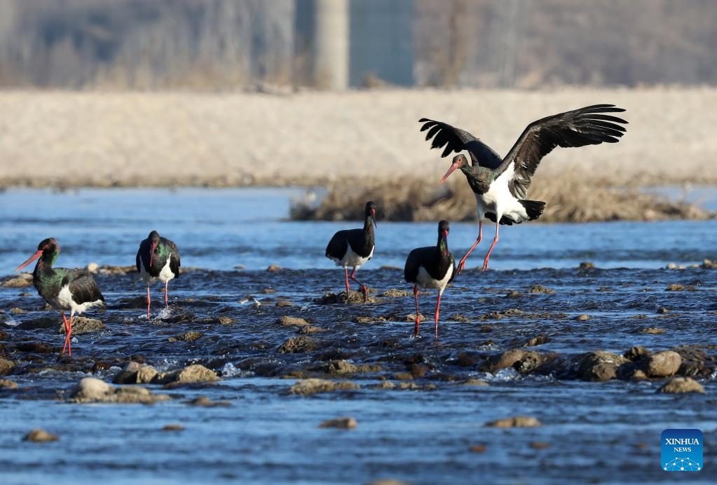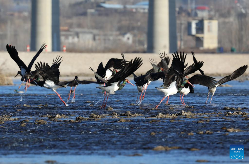 Black storks frolic at Mianman River in Jingxing County, north China's Hebei Province, Dec. 22, 2022. (Xinhua/Yang Shiyao)