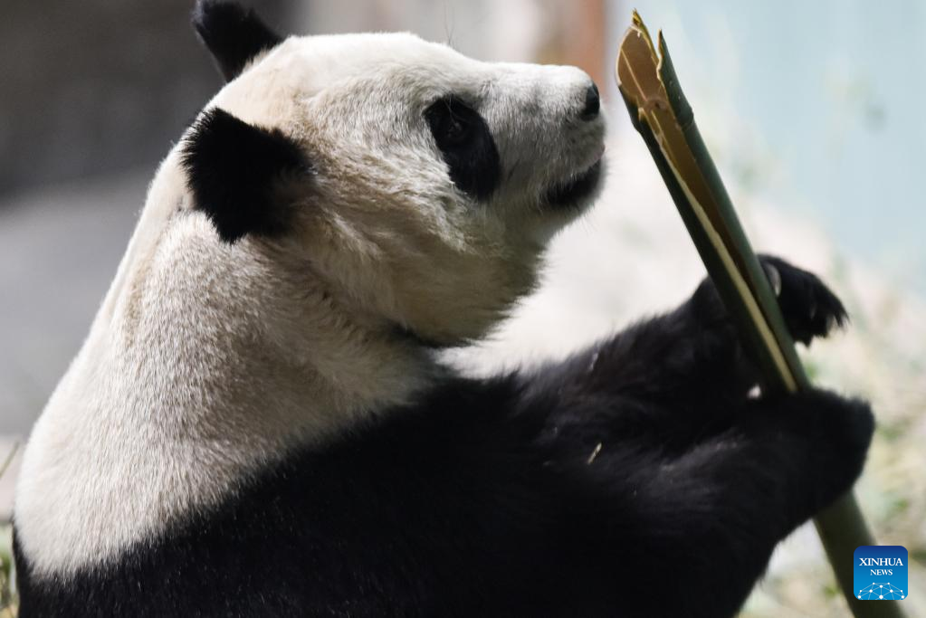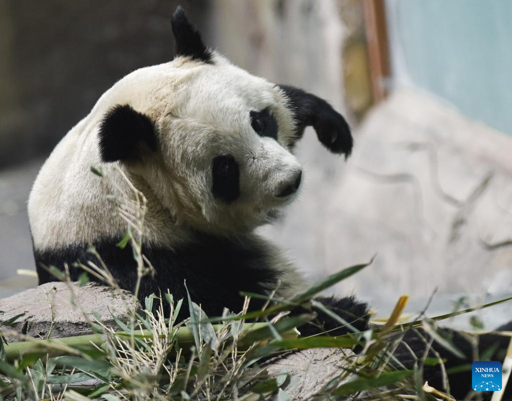 A giant panda eats bamboo at Xining Panda House in Xining, capital city of northwest China's Qinghai Province, Dec. 22, 2022. (Xinhua/Wu Gang)