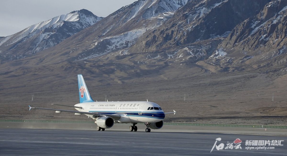 The flight CZ5193, operated by China Southern Airlines, landed at the Taxkorgan Airport at 10:59 am, Dec 23, 2022. [Photo/ts.cn]