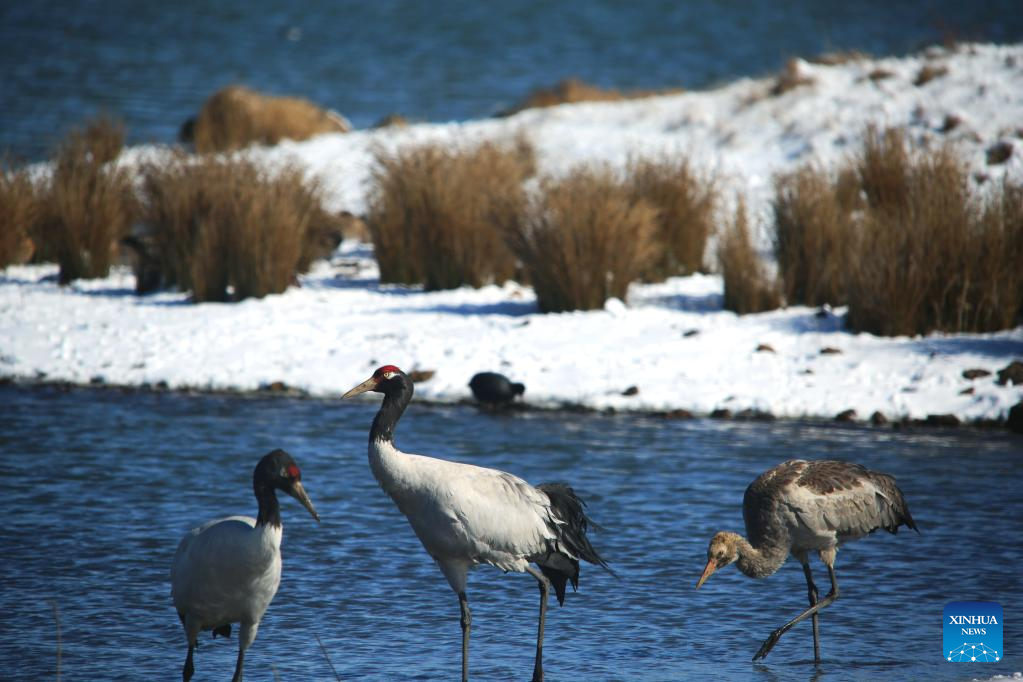 Black-necked cranes are pictured at the Yunnan Dashanbao National Nature Reserve for Black-necked Cranes in Zhaotong City, southwest China's Yunnan Province, Dec. 17, 2022. (Photo by Wu Taiping/Xinhua)