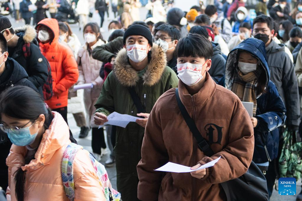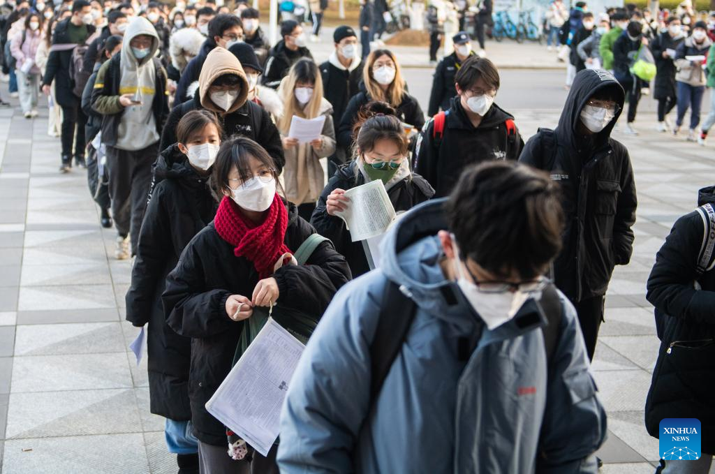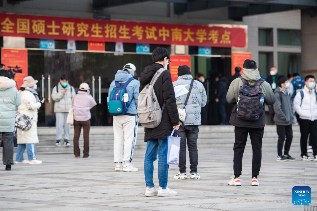 Examinees line up to enter the examination sites at Central South University in Changsha, central China's Hunan Province, Dec. 24, 2022. China's annual graduate school entrance exam kicked off on Saturday. (Xinhua/Chen Sihan)