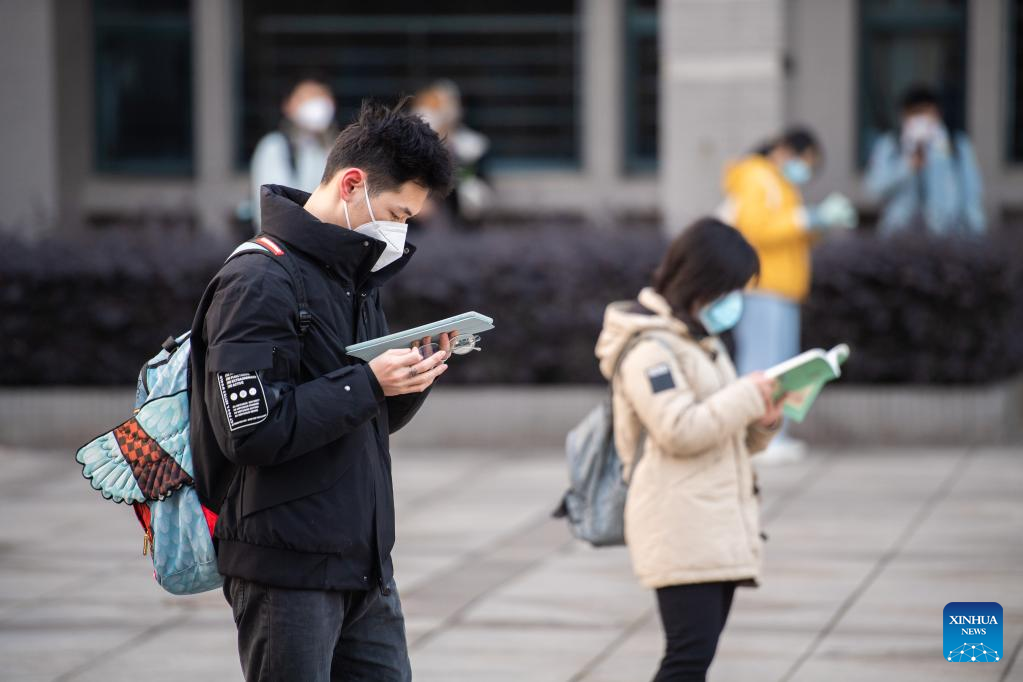Examinees review their study materials outside the examination sites at Central South University in Changsha, central China's Hunan Province, Dec. 24, 2022. China's annual graduate school entrance exam kicked off on Saturday. (Xinhua/Chen Sihan)