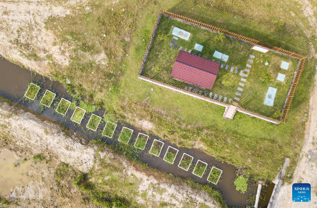 This photo taken on Dec. 24, 2022 shows artificial floating islands installed on a tributary of the Baoling River in Wenchang, south China's Hainan Province. (Xinhua/Pu Xiaoxu)