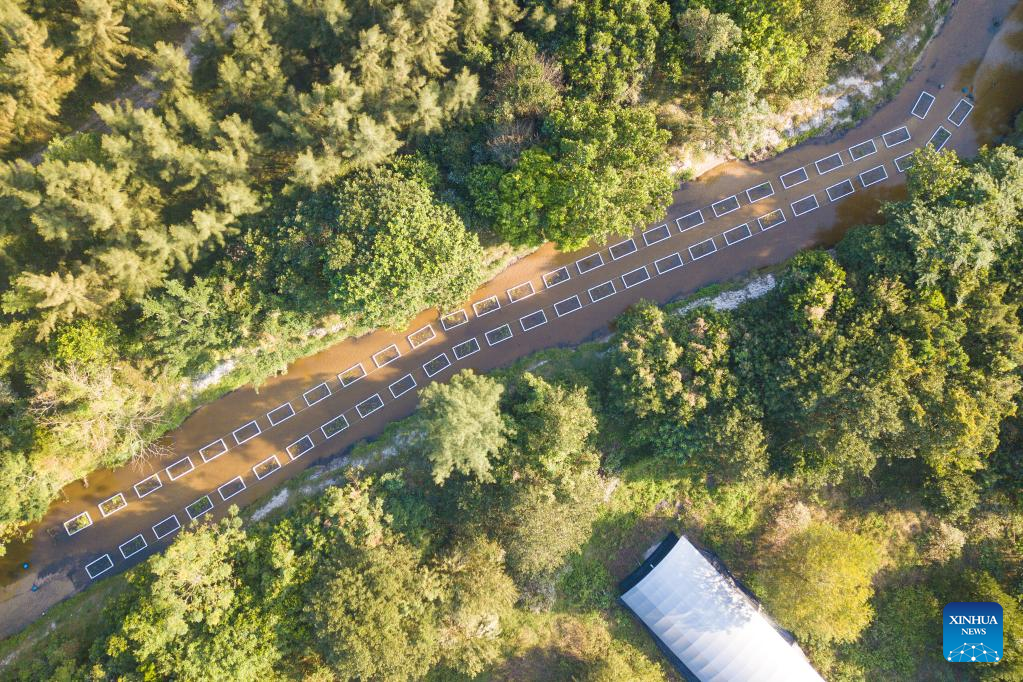 This aerial photo taken on Dec. 24, 2022 shows artificial floating islands installed on a tributary of the Baoling River in Wenchang, south China's Hainan Province. (Xinhua/Pu Xiaoxu)