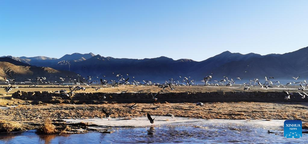 This photo taken by mobile phone on Dec. 24, 2022 shows a flock of black-necked cranes in Lhunzhub County of Lhasa, capital of southwest China's Tibet Autonomous Region. (Xinhua/Shen Hongbing)