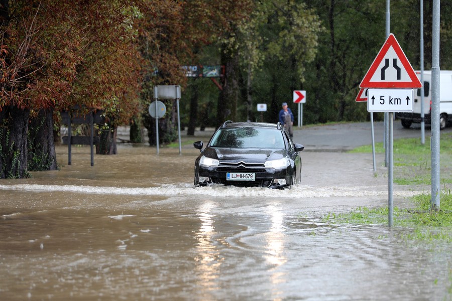 A car moves in flood water after heavy rain in Brod na Kupi, Croatia, Sept. 29, 2022. (Goran Kovacic/PIXSELL via Xinhua)