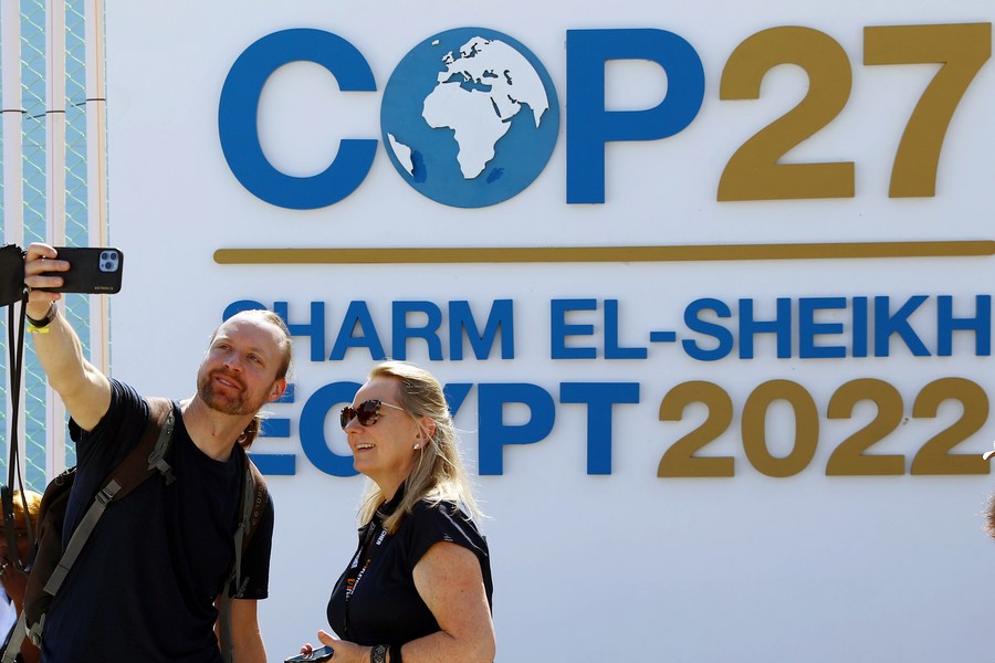 People take selfies with a board showing the ongoing 27th session of the Conference of the Parties (COP27) to the United Nations Framework Convention on Climate Change in Sharm El-Sheikh, Egypt, Nov. 7, 2022. (Xinhua/Ahmed Gomaa)