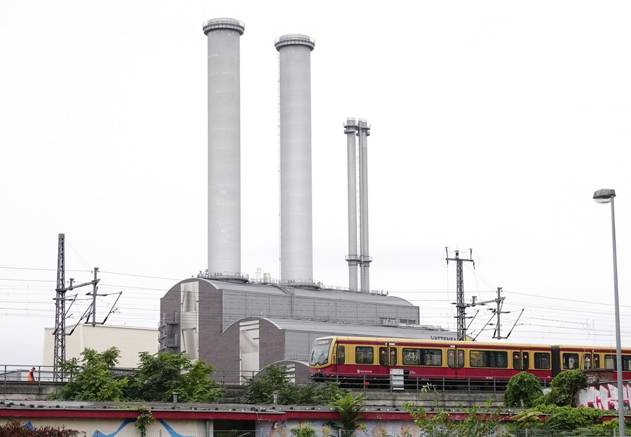 A train passes a thermal power plant in Berlin, Germany, Sept. 8, 2022. (Xinhua/Ren Pengfei)