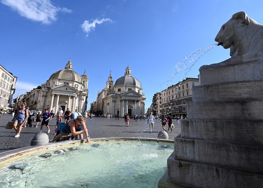 A woman refreshes herself with the water from a fountain at Piazza del Popolo in Rome, Italy on Aug. 5, 2022. (Photo by Alberto Lingria/Xinhua)