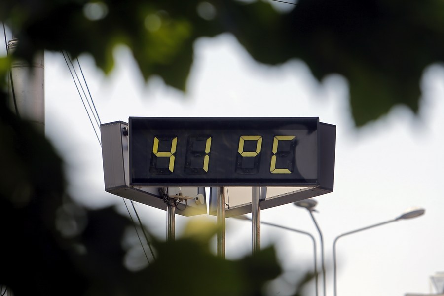 A thermometer shows 41 degrees Celsius in front of a building in Bucharest, capital of Romania, July 24, 2022. (Photo by Cristian Cristel/Xinhua)