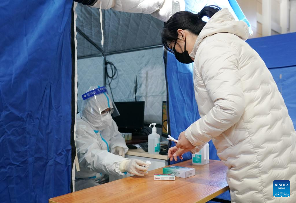A medical worker passes medicine to a citizen in a makeshift fever clinic in Guang'an Gymnasium in Beijing, capital of China, Dec. 24, 2022. (Xinhua/Zhang Chenlin)