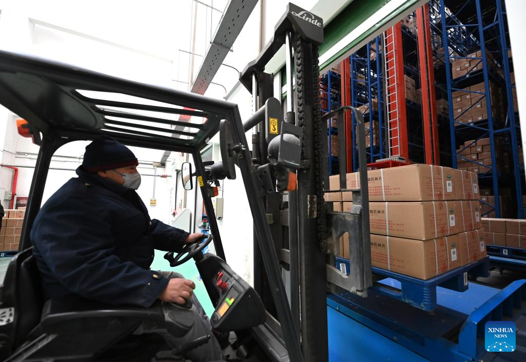 A worker transfers medicine at a pharmaceutical company in north China's Tianjin, Dec. 24, 2022. (Xinhua/Zhao Zishuo)