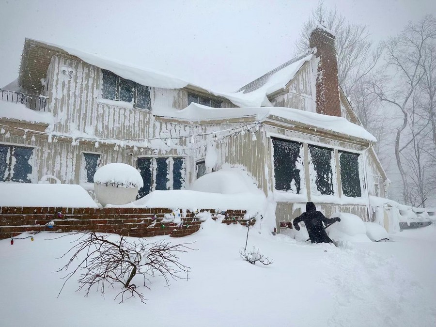 A resident removes snow from a building in Amherst, Erie County, New York State, the United States, Dec. 24, 2022. (Xinhua)