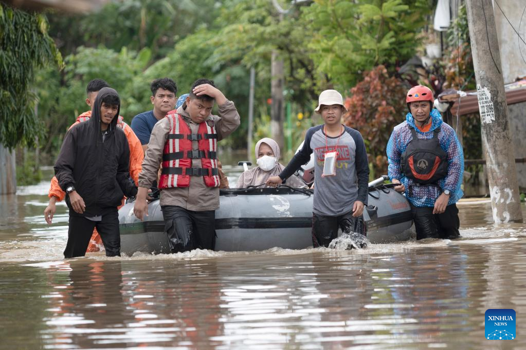 Rescue team members help evacuate people from a flooded area after heavy rain in Makassar, South Sulawesi, Indonesia, Dec. 26, 2022. (Photo by Niaz Sharief/Xinhua)