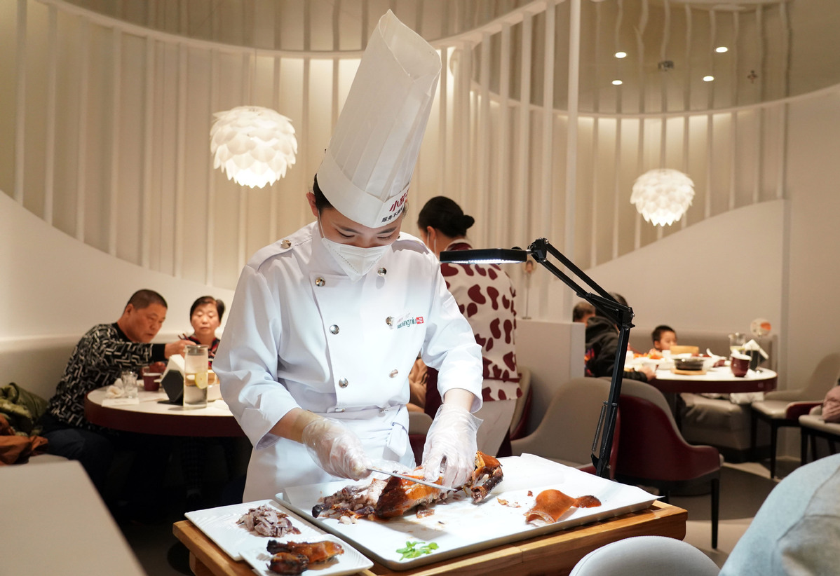 A cook serves roast duck for customers at a restaurant of a shopping mall in Beijing, capital of China, Dec 25, 2022. [Photo/Xinhua]