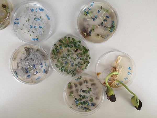 Freshly germinated seeds in Petri dishes. (Photo/Yu Sinan)