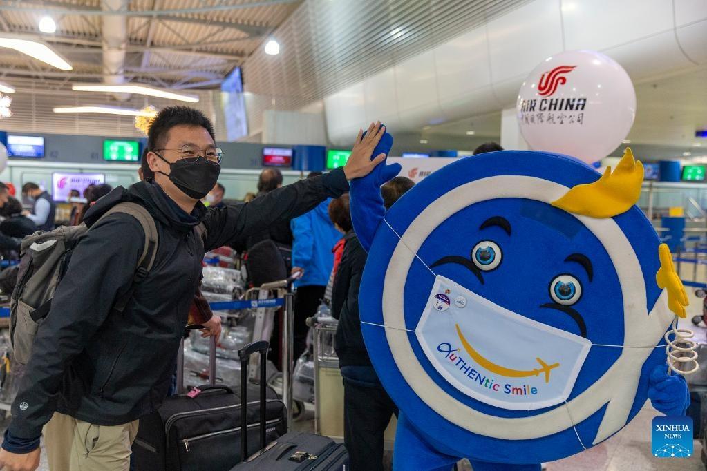 A passenger poses for a photo with an airport mascot at Athens International Airport in Greece, on Dec. 22, 2022. Air China launched a new direct flight between China's Shanghai and Greece's Athens on Thursday at Athens International Airport (AIA), the first direct flight between the two cities. [Photo/Xinhua]