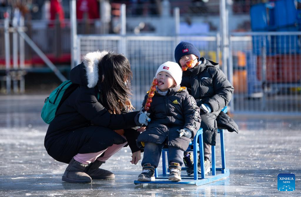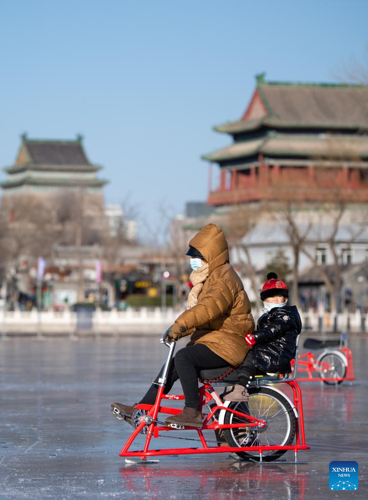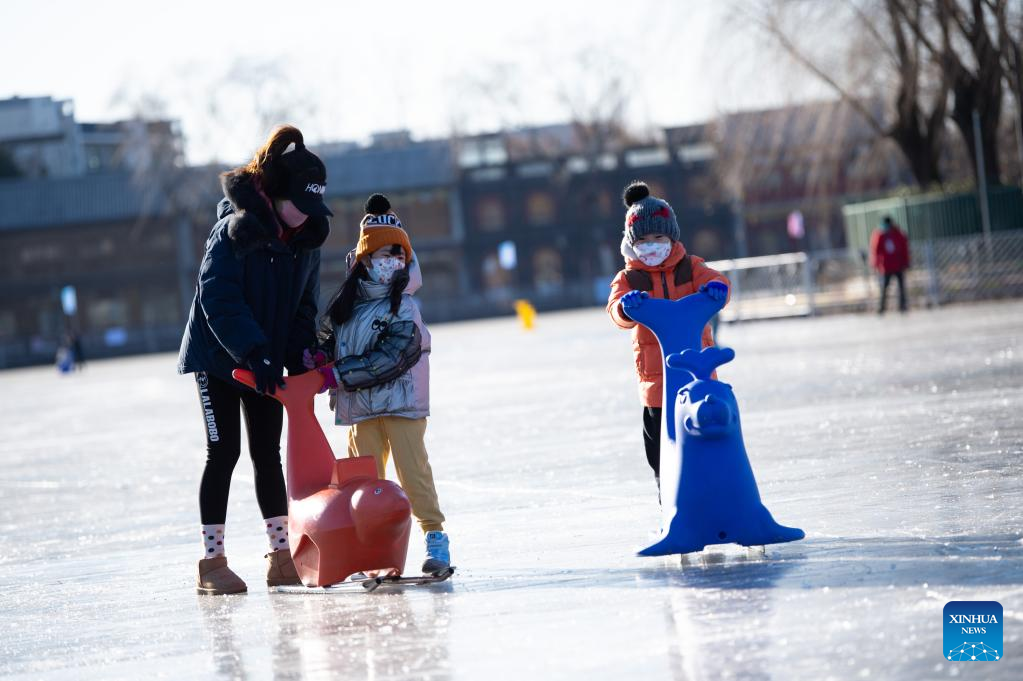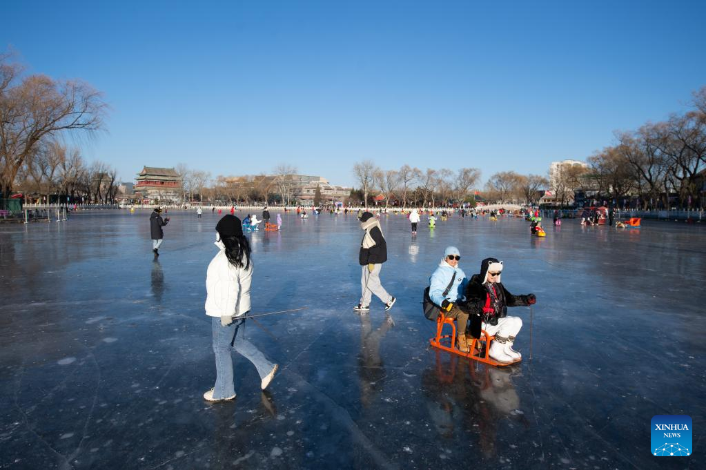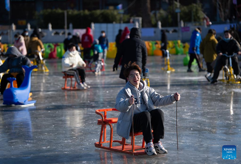 People play on the frozen Shichahai lake which has been turned to an ice rink in Beijing, capital of China, Dec. 27, 2022. The ice rink opened to the public on Tuesday. (Xinhua/Chen Zhonghao)