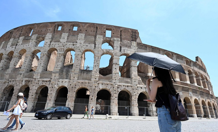 A woman shelters from the sun with umbrella during hot weather at the Colosseum in Rome, Italy, June 17, 2022. (Photo by Alberto Lingria/Xinhua)