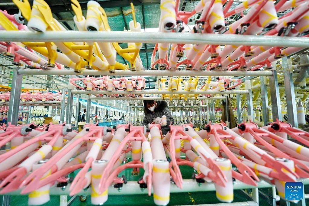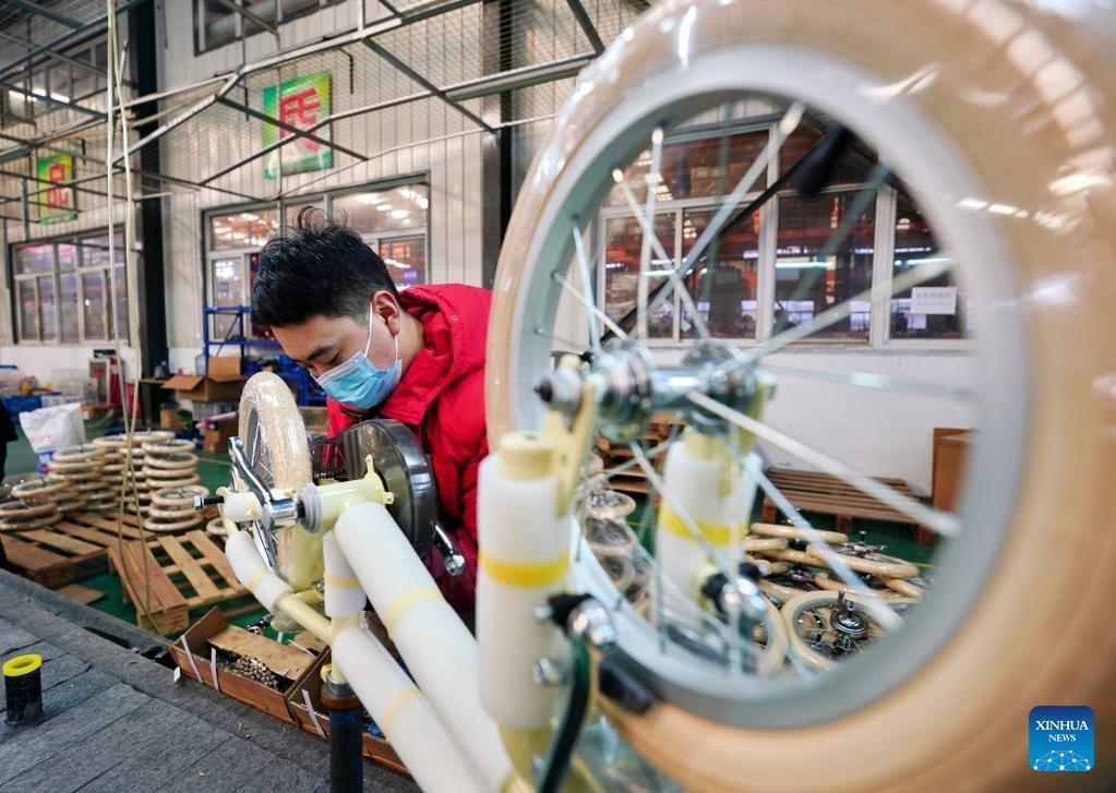 A worker is seen busy on the production line at a factory of a bicycle and baby stroller manufacturer in Pingxiang County, north China's Hebei Province, Dec. 27, 2022. (Xinhua/Mu Yu)